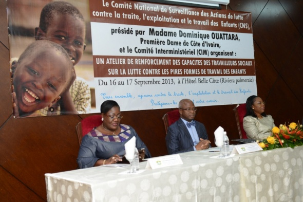 Le Comité National de Surveillance des Actions de lutte contre la traite, l’exploitation, et le travail des Enfants (CNS), en collaboration avec le Comité Interministériel (CIM) continue,  sa série de formation des acteurs sociaux sur l’épineuse question des pires formes de travail des Enfants. Ainsi, cette structure, pilotée par la Première Dame, Mme Dominique Ouattara organise du 16 au 17 Septembre 2013 à l’Hôtel Belle Côte  de la Riviera Palmeraie, un atelier de renforcement des capacités  des travailleurs sociaux sur la problématique du travail des enfants.  Et ce, après trois (03)  précédents ateliers de formation sur la question qui ont eu pour cible, le corps préfectoral, les responsables de la communication des Ministères Techniques, puis,  les Gendarmes et Policiers.